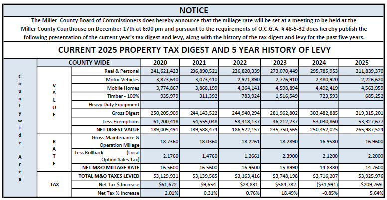 In accordance with the official code of Georgia annotated 45-5-264.1, the Miller County Board of Assessors must notify property owners prior to making a site visit. Notice is hereby given that a representative if the appraisal staff and Contractors will review and inspect all properties that have changed ownership in the last twelve months, obtained a building permit for construction, made a return of value on the property, reported fire damage, demolition and or filed an appeal as well all property Located in the East side of the County. These appraisal reviews may include measuring structures, listing construction information, and photographing the subject property. A majority of these field reviews will take place between Nov 8th thru Dec 31st   of the current year during normal business hours.